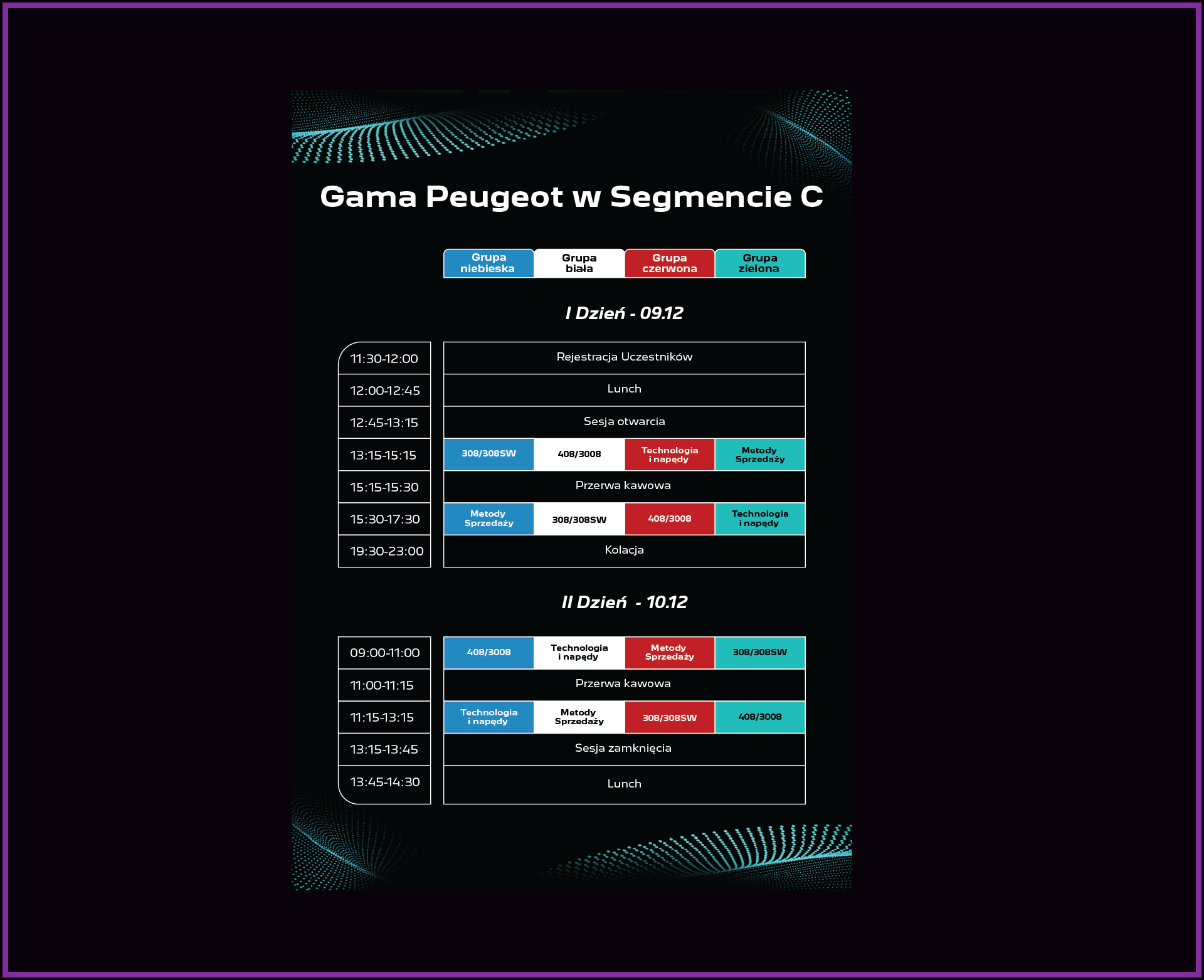 K&C Media Group objęła kompleksową obsługę multimedialną i eventową czterodniowej konferencji Peugeot, skierowanej do czterech grup docelowych: mediów i VIP-ów, klientów B2B i flotowych, dealerów oraz uczestników szkoleń sprzedażowych. Łącznie wydarzenie zgromadziło ponad 200 uczestników. Celem było wzmocnienie pozycji Peugeot jako lidera segmentu C — z flagowym modelem 308 jako bohaterem ekspozycji, uzupełnionym przez 408, 3008 i pełną gamę modelową.